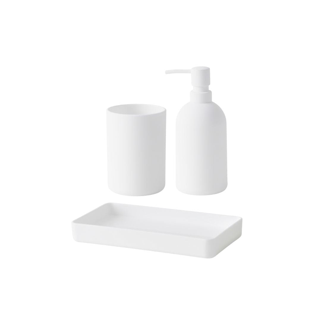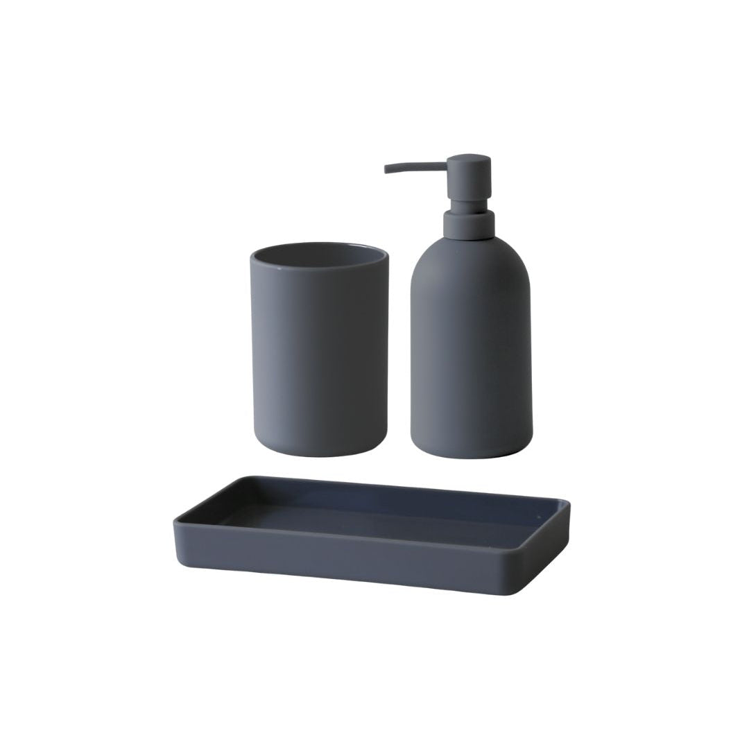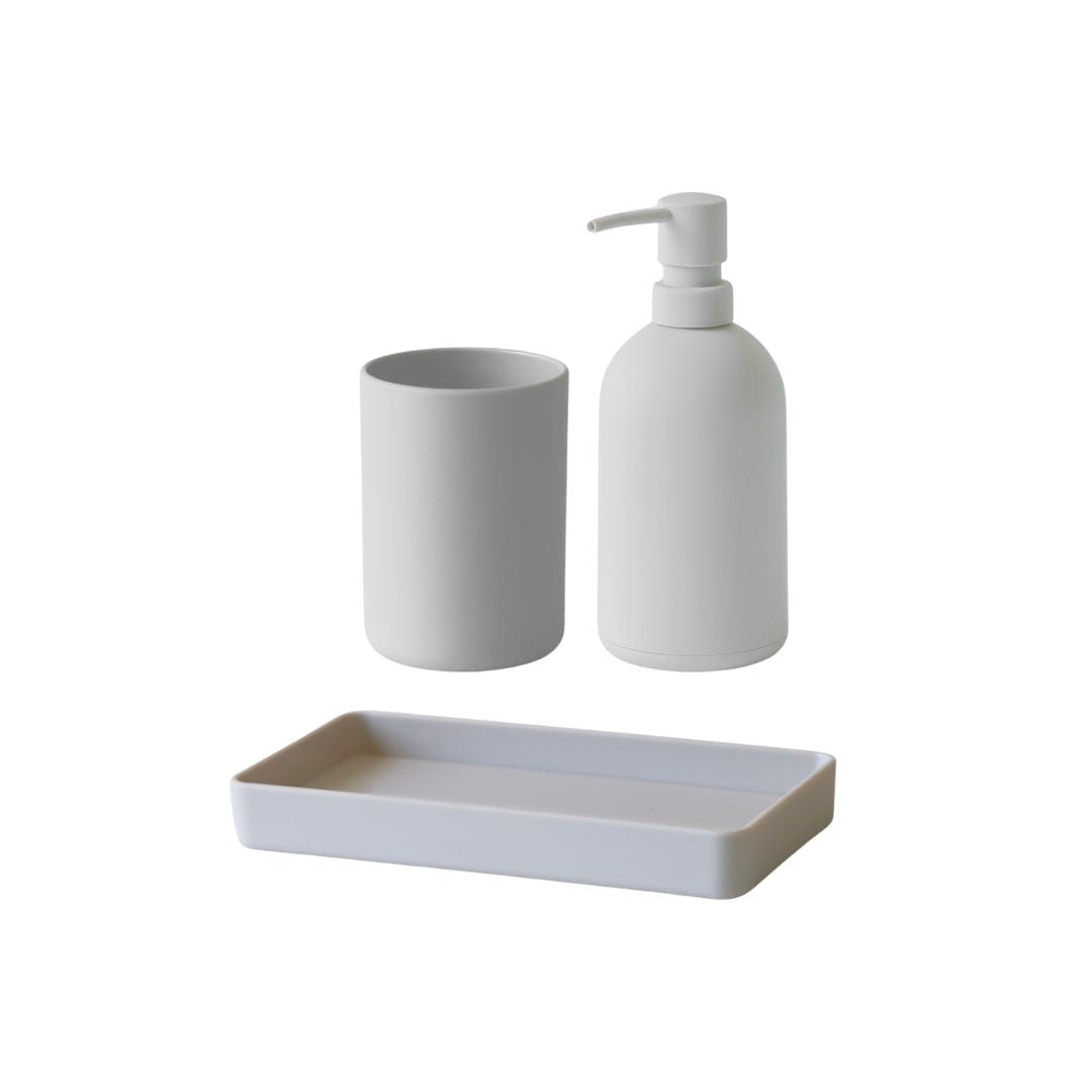 סט אביזרי אמבטיה 3 חלקים מסדרת PORTO בעיצוב מינימליסטי ונקי. הסדרה משלבת פונקציונליות יומיומית עם מראה מודרני ואחיד. הסט כולל דיספנסר, כוס למברשות שיניים ומגש תואם.