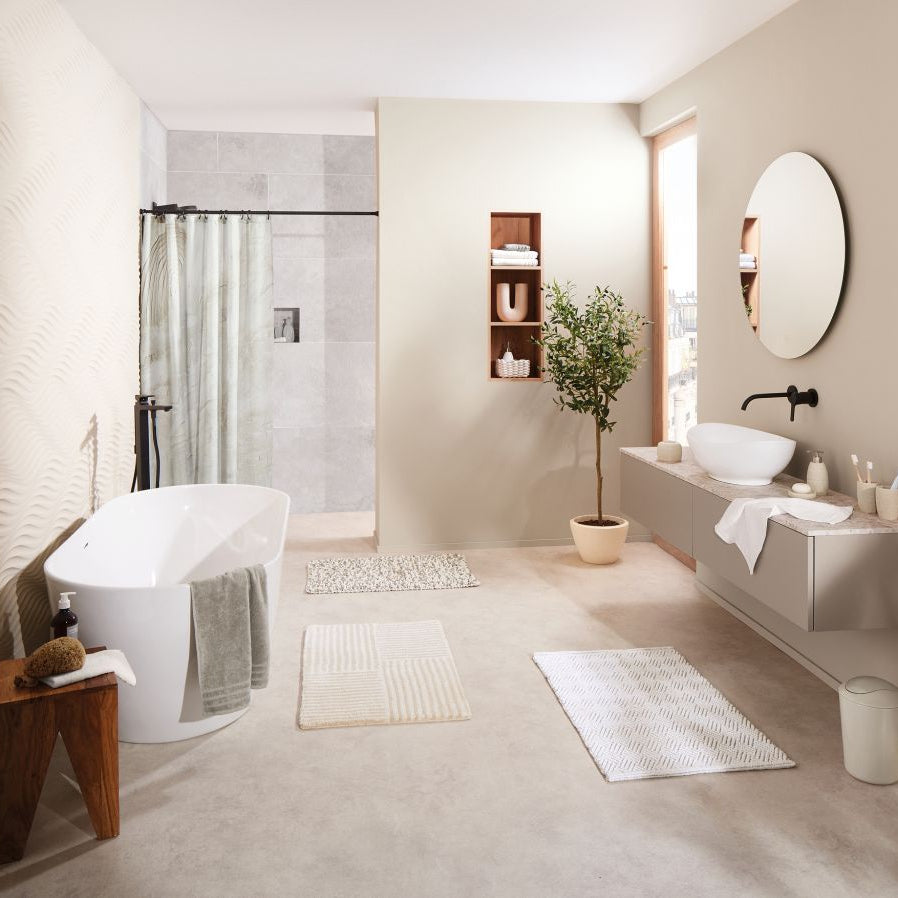 שטיח לאמבטיה Chelsea מבית Kleine Wolke, בגוון בז’ חולי רך מוסיף חמימות ותחושת רוגע לכל חדר רחצה. השטיח עשוי מ־100% פוליאסטר ממוחזר – בחירה ידידותית לסביבה. הסיבים הגבוהים (20 מ"מ) יוצרים מגע רך ונעים, ואילו בסיס מונע החלקה מעניק יציבות ובטיחות גם על רצפה רטובה. מתאים לשימוש גם עם חימום תת־רצפתי, ומשלים כל חלל מודרני בגימור אלגנטי עם טקסטורה פסים בגווני בז’ ולבן.